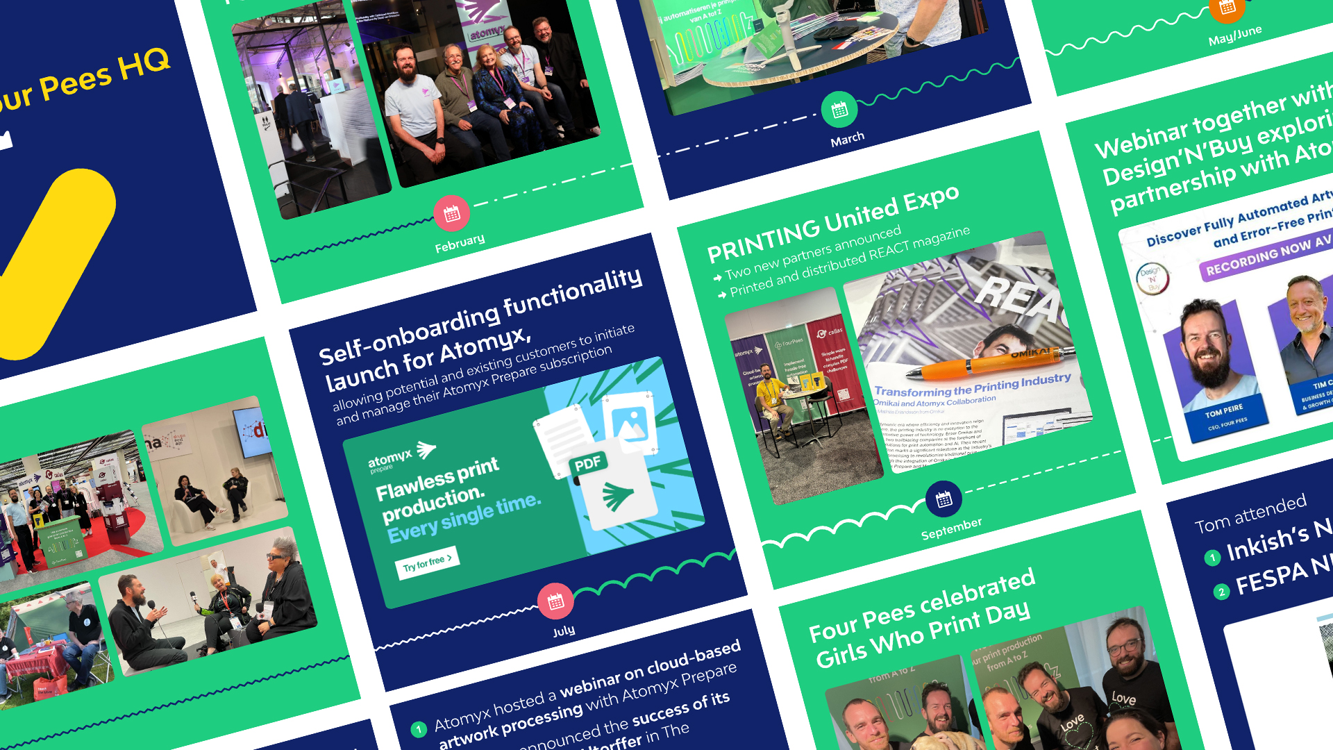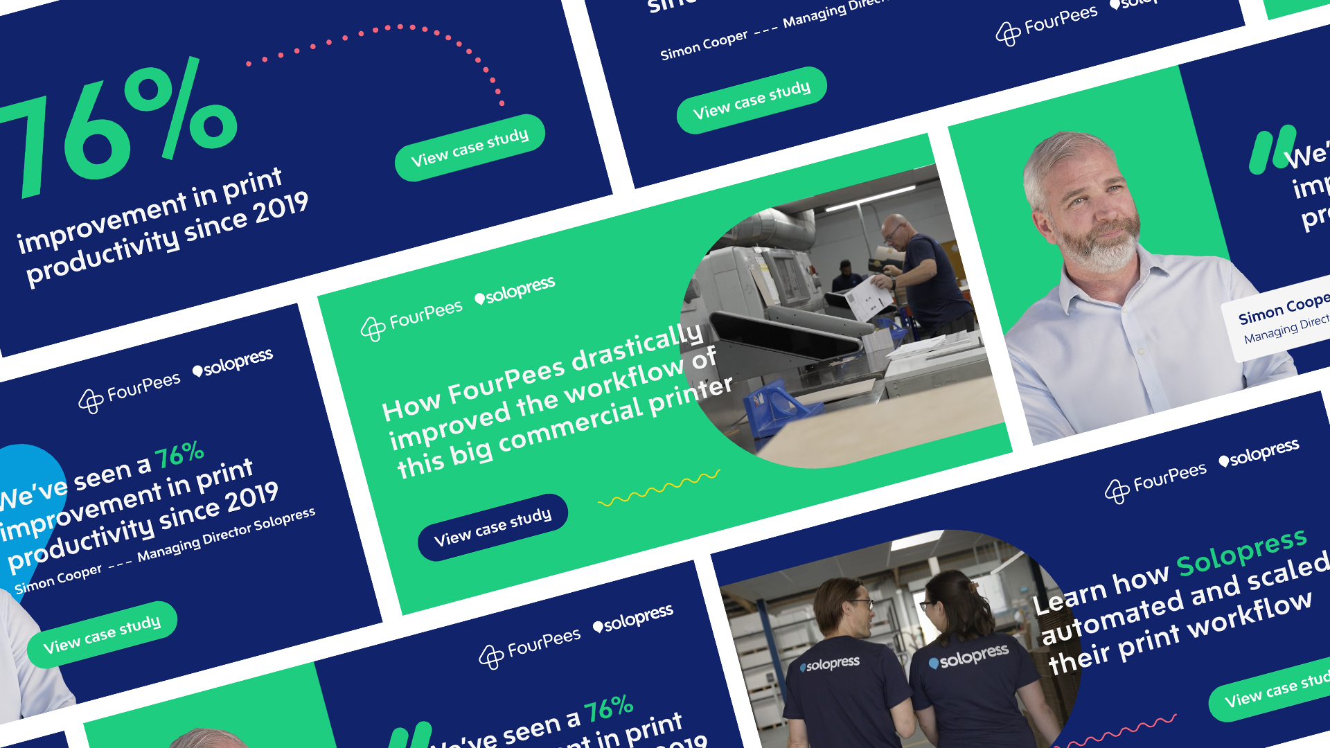 Voor Four Pees (een SaaS-platform voor de printindustrie) heb ik meerdere infographics, online presentaties en social visuals ontworpen. Hiermee hielp ik het technische verhaal visueel te vertalen, zodat complexe processen binnen printautomatisering helder en aantrekkelijk gepresenteerd werden.